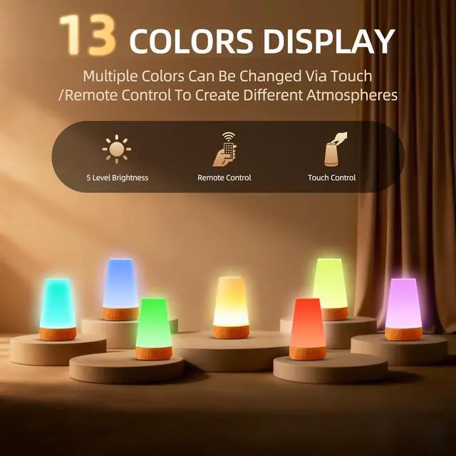 Night Light, Dimmable Touch Lamp and Remote Control, 13 RGB Colors & 5 Brightness, Rechargeable Bedside Table Lamp for Baby Kids Nursery Bedroom Bathroom Camping (Wood Grain)